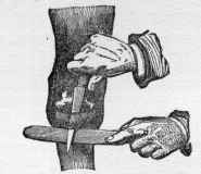 one, marked by lines into eight equal sections, each section holding a quart. One or two quarts is the limit of an ordinary bleeding. Authorities tell of a “ bloodstick,” which is unnecessary, as the fist is just as good.