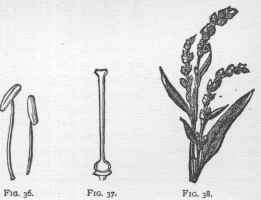 we shall see therein, standing at the top of the tube, six thread-like bodies side by side: five of these are all alike; the sixth, which stands in the middle, is different. The five are called stamens, and the one which is unlike any of the rest is the pistil. There are other flowers, equally com mon, in which we shall be able to distinguish them better. Let us try a honeysuckle or a prim rose. A stamen consists of a thread-like stalk, which is called the. filament, and a thicker, some what oblong head, which is the anther (Fig. 36). Sometimes the filaments are more or less united, either at the base only, or nearly throughout their length, and in a few instances are so short as scarcely to be seen. The anther is by far the most important part of the stamen : it contains a mass of fine granules, which is dispersed like dust when the anther opens. This dust is the fertilizing principle, and is called the Pollen. In orchids the pollen is compacted together in waxy