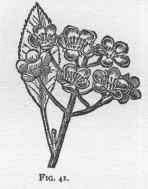 raceme in which the peduncles are branched, each pedicle, or branch, of which bears its flower (Fig. 40). Several kinds of grasses produce their flowers in panicles. There is a kind of inflores cence called a corymb, in which the peduncles are simple, springing from different points on the axis, as in a raceme, but the lower peduncles are lengthened, so that all the flowers are brought nearly to the same level (Fig. 41). If the pe duncles are branched, it becomes a compound corymb.