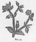 One of the most complex forms of inflorescence is the cyme, which should be studied in its mode of development. It is common in the stitchwort family (Fig. 42). The stem terminates in a flower, then branches arise from the axils of a pair of bracts a little lower down : these are each surmounted by a flower. In turn each of these secondary flowers is supplemented by branches from the axils of its bract, and thus the pro cess is repeated till the shoot is exhausted.