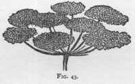 A very characteristic inflorescence is the um bel, in which all the flowers are supported on pe duncles of equal length, springing from the same point; but if each peduncle supports a secondary umbel, the result is a compound umbel, as in the carrot, parsnip, hemlock, angelica, and many other common plants (Fig. 43), which are hence called u7nbellifer0us, and constitute a generally easily recognized natural order.