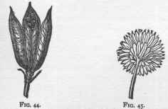 Flower-Buds.—Flower-buds proceed from the axils of leaves. The axil is the angle formed by the junction of the leaf with the stem. Such leaves are termed floral leaves, or bracts. Oc casionally the bracts are of the same color and form as the remaining leaves of the same plant, but generally they are smaller, and altered in form. In a few instances they are colored. If we gather a daisy or a dandelion, we shall ob serve just beneath the head of flowers, and closely pressed to the under side, a whorl or circle of little green leaves or bracts, and this whorl of bracts is termed an involucre (Fig. 45). The cap of an acorn is a kind of involucre com posed of numerous scaly bracts.