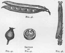 Dehiscent Fruits.—We will commence with de hiscent fruits, or those which open as they ap proach maturity. The follicle, or little bag, which opens down the inner side (ventral su ture), and never down the back (dorsal suture), as in the common columbine (Fig. 44); the legume, opening either down the front or back, or along both sutures, as in the pea and bean (Fig. 46); the capsule, which opens by valves or pores (Fig. 47), and occasionally by a lid, of which the foxglove, the poppy, and the henbane are examples; the siliqua, a kind of flat capsule
