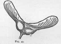 opening by two valves (from below upwards), leaving the seeds attached on both sides of a central partition (Fig. 48), as in the wallflower and cabbage; the cone, or strobilus consists of a dense scaly spike, each scale with seed at the base; when mature, the scales fall back and permit the seeds to escape. It will be observed that all the kinds above enumerated are dry, and not pulpy fruits.