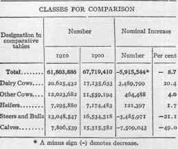 The number of animals classed as steers and bulls declined from 16,535,000 in 1900 to 13,- 049,000 in 1910, or 21.1 per cent, and had there been no change in the date of enumeration or method of classification the decline would have been even greater.