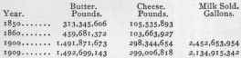 That is, in 1850 there were made about 13½ pounds of butter and nearly 4½ pounds of cheese for each person ; in 1880 there were made about 15½ pounds of butter and a shade over half a pound of cheese for each person. “ Milk sold” bears no appreciable proportion to milk used. In Butter production, New York led off in 1850 with 79,766,694 pounds, followed by Pennsylvania with 39,878,418 pounds; in i860 New York still led with 103,097,289 and followed again by Penn sylvania with 58,653,511 pounds; in 1870 the same two States remain at the head in the same order with 107,147,526 and 60,834,644 pounds respectively; and in 1880 our old friends are still there, New York at the head with 111,922,423 and Pennsylvania with 79,336,012 pounds. St. Lawrence was the banner Butter county of New York, showing in 1870, 8,419,695, and in 1880, 6,973,020 pounds. But as St. Lawrence has an area of 2900 square miles, her return in 1880 shows about 2405 pounds to the square mile, while Franklin County, Vt., returns in 1880 4,066,240, or an average of 6465 pounds to each of its 629 square miles.