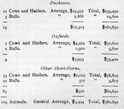 association of cattle-breeders in the Scioto Val ley, Ohio, sent an agent to England who pur chased the best animals he could find, imported nineteen into Philadelphia, and drove them to Ohio. Other importations were made by this association and others, and in 1837 to 1839 a great English breeder named Whittaker sent over more than a hundred Short-Horns, which he sold at auction at good prices. These animals went into Pennsylvania, Ohio and Kentucky. In 1850 the herd of Thomas Bates was sold, and the best of his choice stock fell into the hands of Lord Ducie, already the owner of a noble herd. He died, and in 1853 a peremptory sale of his stock was widely advertised. At this sale Samuel Thorne, of Dutchess County, N. Y., bought several of the best and highest-priced animals, and added to them other choice animals from other herds. These were brought over and bred here, and with other importations and constant and successful attempts at improvement, the United States turned the scale, and has repeat edly sold to Englishmen Short-Horn stock to go back.