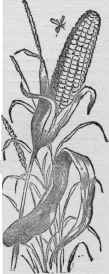 This list might be indefinitely extended; for so universal was the use of maize by the aborigi nes, that its mention is to be found in nearly all the early chroniclers, and it seems never to have been grown as a luxury simply, but rather as a source of supply, and as a staple food. In the southern country it was so largely grown that many tribes may be considered as agriculturists rather than as hunters; in the northern countries it shared with the products of the chase the claims of a sustenance. Its merits, too, were quickly recognized by Europeans, and it soon found introduction to Europe and a wide distri bution. It had a strong agency in the settle ment of this country, as it afforded relief from starvation to the “ Conquisitors " in the South, and to plain Miles Standish and his contempo raries in the North. The Indian made his con quest the more easy by feeding his invaders from the produce of his corn-field, and the parched grain supported him again in his defense. Among the more imaginative Indians of the South maize became an object of worship, and a means of conferring hon or : it formed portions for gifts, and in one instance was poured upon the ground for the trampling of the horses, as an earnest of welcome to the Spaniard. ‘ Everywhere the grain sup plied food, in many places was parted into a drink, and the leaves and stalks were crushed to secure the juice to be boiled into a sirup or sugar, and the stalks were used to form bags and other material of wigwam use. It is passing strange that the corn-plant does not appear upon the coat of arms of any of the States whose early necessities it relieved.