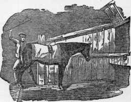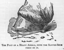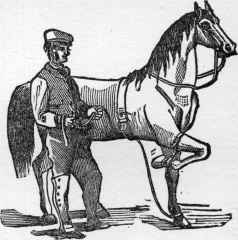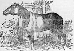 Russian and Electric baths are also employed. In the Russian baths, the steam is let out of the pipes into the room, till the atmosphere is wet enough to bottle. Here the horses sometimes rebel, but do not make any vigorous resistance. Several horses, too sick to stand up, have been treated. For their accommodation there is a stout blanket, fastened to ropes running through pulleys in the ceiling. The blanket is put under the horse's body, the ropes are tightened, and he takes his bath swinging in a hammock.