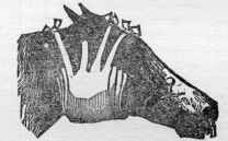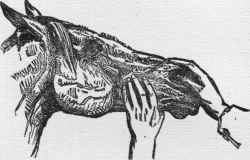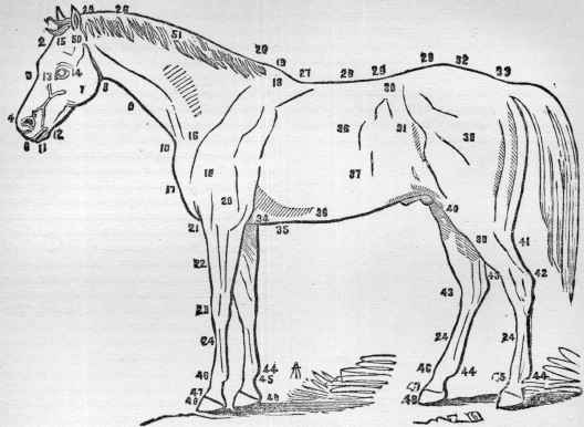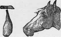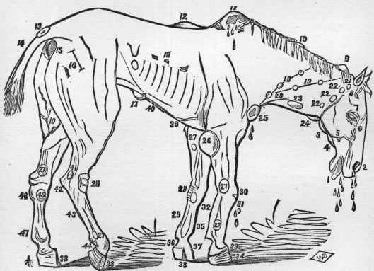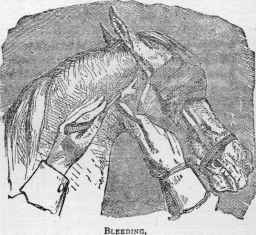 For general bleeding the jugular vein is selected. The horse is blindfolded on the side on which he is to be bled or his head turned well away; the hair is smoothed along the course of the vein with the moistened finger; then with the third and little fingers of the left hand, which holds the fleam, pressure is made on the vein sufficient to