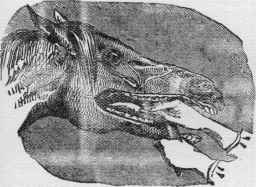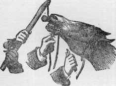 The Old Way.—Such a form of immunity is, however, seldom sought. A sufficient security is in all ordinary cases afforded by the horse's tongue, which, when a ball is to be administered, is grasped by the left hand, and withdrawn to the right side of the mouth. The hand thus em-