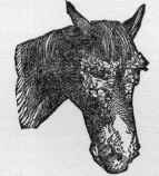 cult to heal. The oil should be applied morning and night, until the scabs peel off. When they begin to loosen, a lather of soap and water ap plied with a sponge may hasten their removal; but no violence must be used. All litter should be carefully removed from the stall; for the sharp ends of the straw, coming in contact with a part rendered so tender and irritable by the blister, will cause very great annoyance to the animal. After the second day, the horse may be suffered to lie down ; but still, the possibility of blemishing himself should be prevented by a cradle, or wooden necklace, consisting of round strips of wood strung together, reaching from the lower jaw to the chest, and preventing the horse from sufficiently turning or bending his head to get at the blistered part.