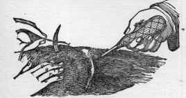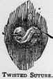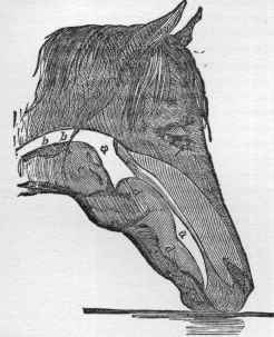 When sufficient blood has been taken, remove the pressure below the orifice and the outward stream will cease. Then put a pin through each side of the wound, and twist, after the fashion of a figure of 8, some tow or thread, or a hair pulled from the horse's tail, round each end. Subsequently remove so much of the pin as may protrude, and the orifice will be closed by what surgeons denominate a twist ed suture. The head of the horse should be tied up for several hours, to prevent his rubbing the part against the manger. In bringing the edges of the wound together, and introducing the pin, care should be taken not to draw the skin too much from the neck, as blood will insinuate itself between the skin and the muscles beneath, and cause an unsightly and sometimes troublesome swelling. Twenty-four hours after the operation, the edges of the wound will have united, and the pin should be with