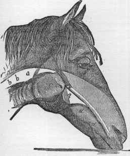 Diagram (Fig. i) explanatory of the Compound Act of Drinking in the Horse. a a. The water drawn into the mouth and forced into the fauces by the compression of the forward part of the tongue and the enlargement of the backward portion of the organ. b b. The fluid passing down the oesophagus or gullet, c. The larynx, lowered to admit the passage of the liquid. dd. The tongue, dilated at one place and contracted at another, e. The soft palate, floated upward and effectually closing the nasal passages.