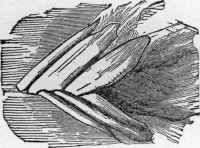 direct line with the course of the vein, and over the precise center of the vein, as close to it as possible, but its point not absolutely touching the vein. A sharp rap with the bloodstick (as in the cut) or the hand on that part of the back of the fleam immediately over the blade, will cut through the vein, and the blood will flow. A fleam with a large blade should always be preferred, for the operation will be materially shortened, which will be a matter of some consequence with a restive horse; and a quantity of blood drawn speedily will have far more effect on the system than double the weight slowly taken ; while the wound will heal just as readily as if made by a smaller instrument.