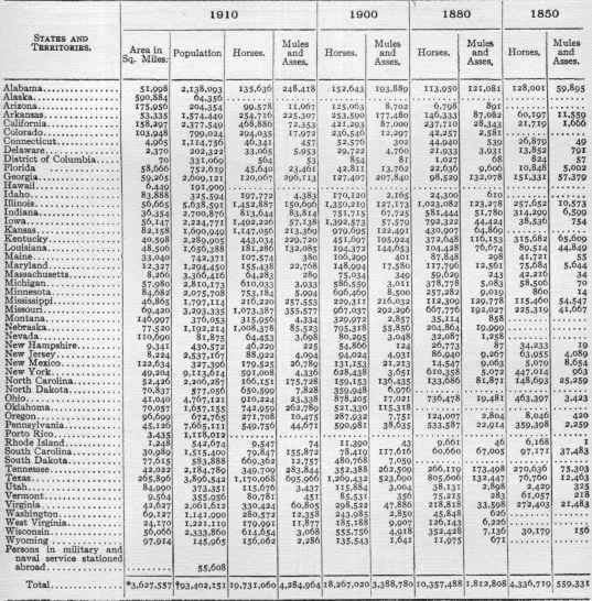 Showing the number of Horses, and of Mules and Asses, in the United States and Territories, ac cording to the Seventh, Tenth, Twelfth and Thirteenth Census: with the area in square miles, and the total population of each State and Territory, according to the Thirteenth Census.
