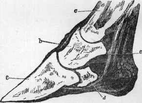 Fig. 91 represents the phalangeal bones in their naturally oblique position. The upper part of the long pastern bone (a), to toe of os pedis (c), is a continuously oblique line. This obliquity of position enables the bone to act as a spring, modifying concussion and giving elasticity of step and freedom from jar. The coronary bone (b) rests entirely on the os pedis. The navicular bone (d), placed posteriorly, bears no weight, but gives increased leverage power to the tendon (e). This bone, like the sesa- moids, is a muscular appendage, and is not intended to support weight. Compare with Fig. 92 on opposite page.