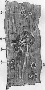 Fig. 157. Part of eæcum (blind gut). a, ilio-cæcal opening. b, b, b, ulcers in various stages.