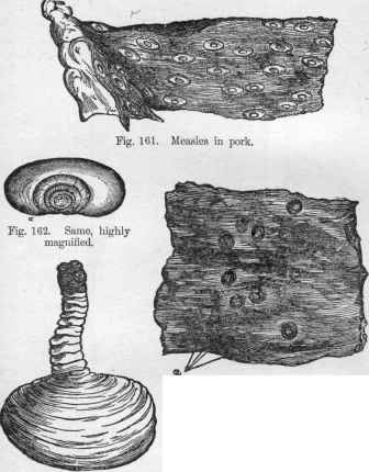 having a small, rudimentary head, with hooks and suck ers, &c. They remain in the body till the pig is slaugh tered, when, if the pork is not thoroughly cooked, they produce full-grown tapeworms. An unusually large num ber of them may kill a hog. They are peculiar to the
